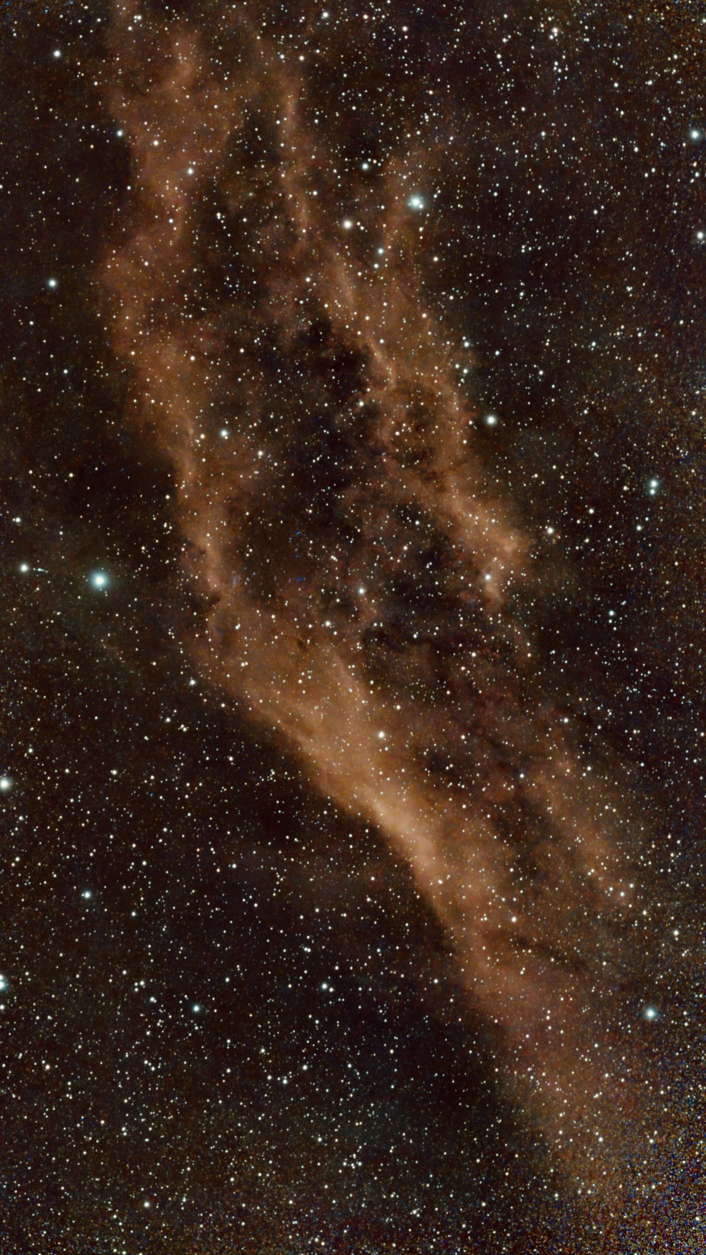 The California Nebula (Also known NGC 1499 or Sh2-220) is an emission nebulalocated in the constellation Perseus. Its name comes from its resemblance to the outline of the US State of California in long exposure photographs.