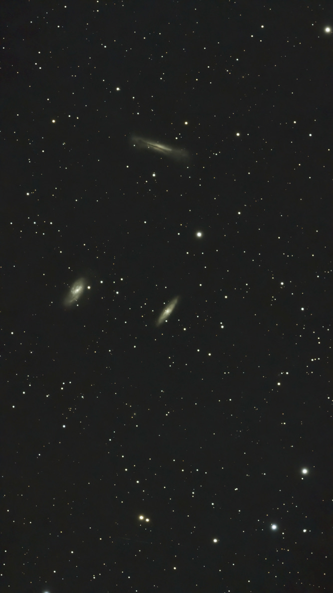 The Leo Triplet Messier 66 or M66, also known as NGC 3627, is an intermediate spiral galaxy in the southern, equatorial half of Leo. It was discovered by French astronomer Charles Messier[8] on 1 March 1780, who described it as “very long and very faint”.[9] This galaxy is a member of a small group of galaxies that includes M65 and NGC 3628, known as the Leo Triplet or the M66 Group.[10] M65 and M66 are a common object for amateur astronomic observation, being separated by only 20′